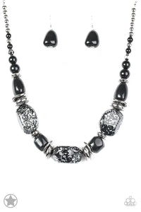 Chunky black beads with speckles of silver and a gorgeous glazed finish are threaded together with thick silver rings and smooth black beads. Features an adjustable clasp closure.